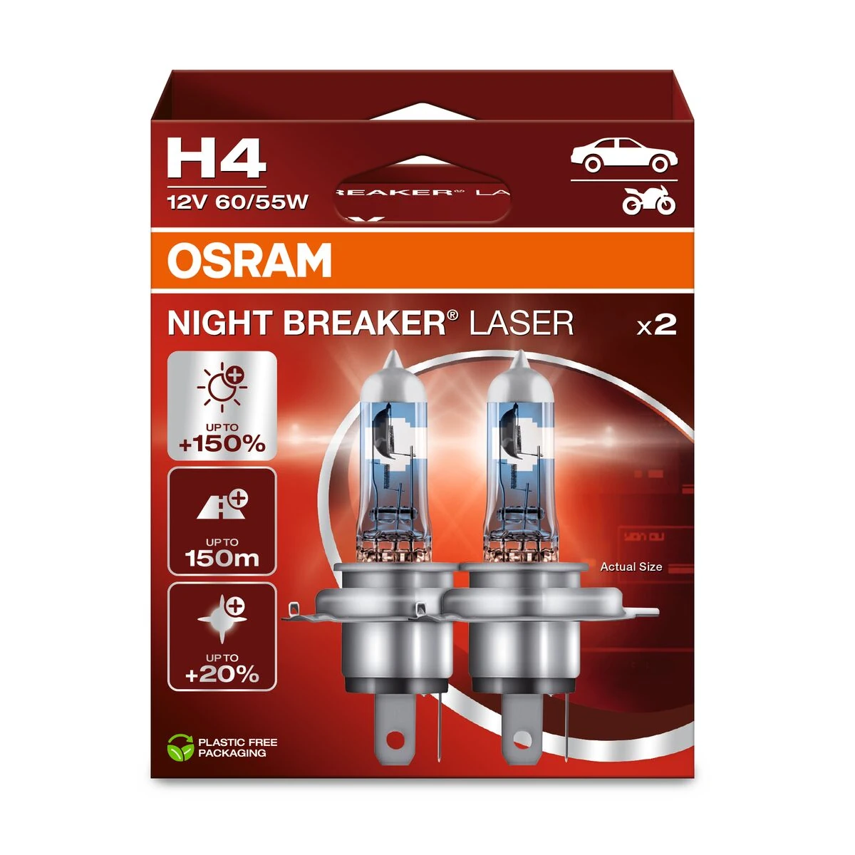 Night Breaker Laser on äärimmäisen tehokas halogeeni-autolamppu. Luotettavan Night Breaker-perheen uusi huipputuote tuottaa enemmän valoa, näkyvyyttä ja turvallisuutta. Jopa 150 % kirkkaampi ja 20 % valkoisempi valokeila kuin vakiohalogeenilamppuilla luovat erinomaiset edellytykset turvalliselle ja väsyttämättömälle ajamiselle. Kantama jopa 150m. Paranneltujen ominaisuuksiensa ansiosta Night Breaker Laser -polttimot parantavat näkyvyyttä ja lyhentävät reaktioaikoja.